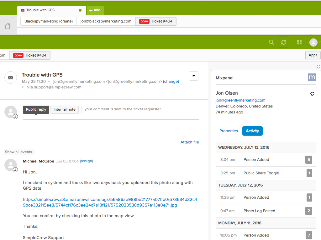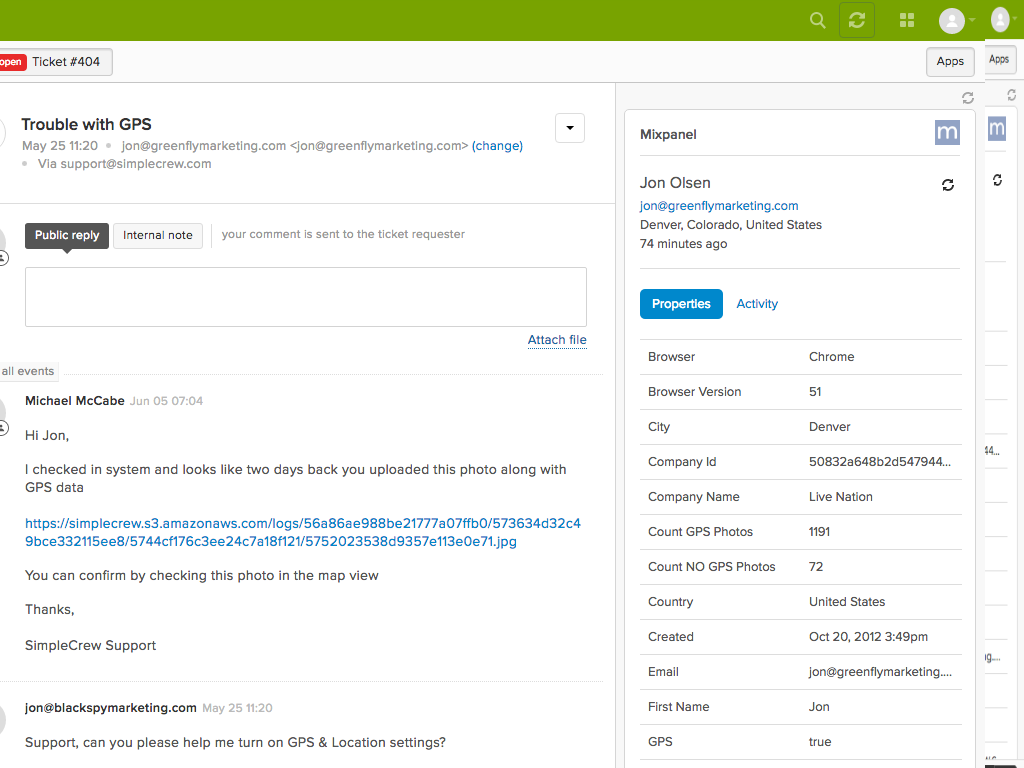 Now, when you navigate to a ticket, you can see information from Mixpanel about the ticket requester in the ticket sidebar. The integration also works in the new Zendesk Chat window.