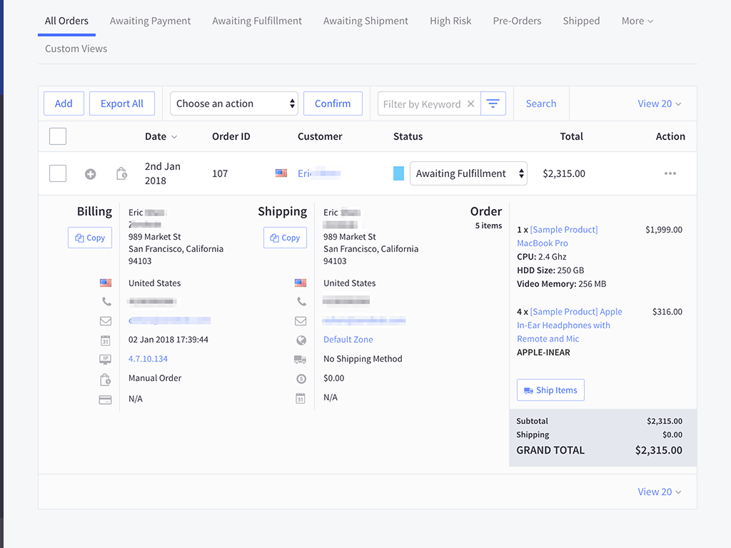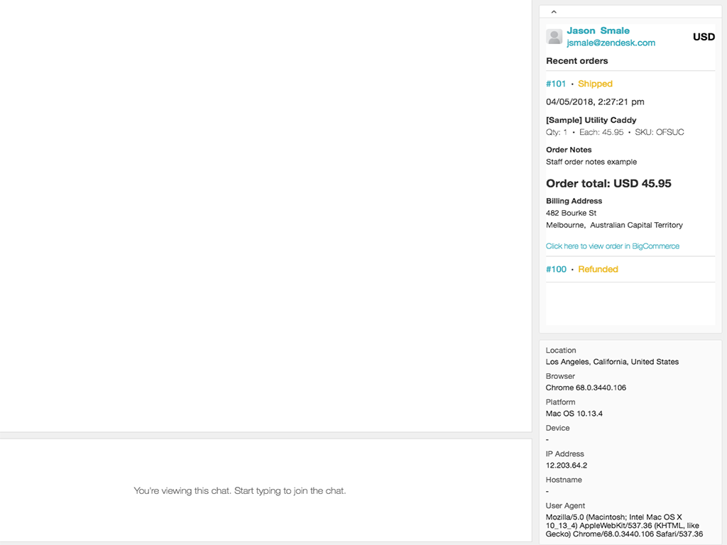 - Solve tickets faster by having access to relevant customer data from BigCommerce, such as billing, shipping, notes, and order information, on Zendesk Chat visitor pages.