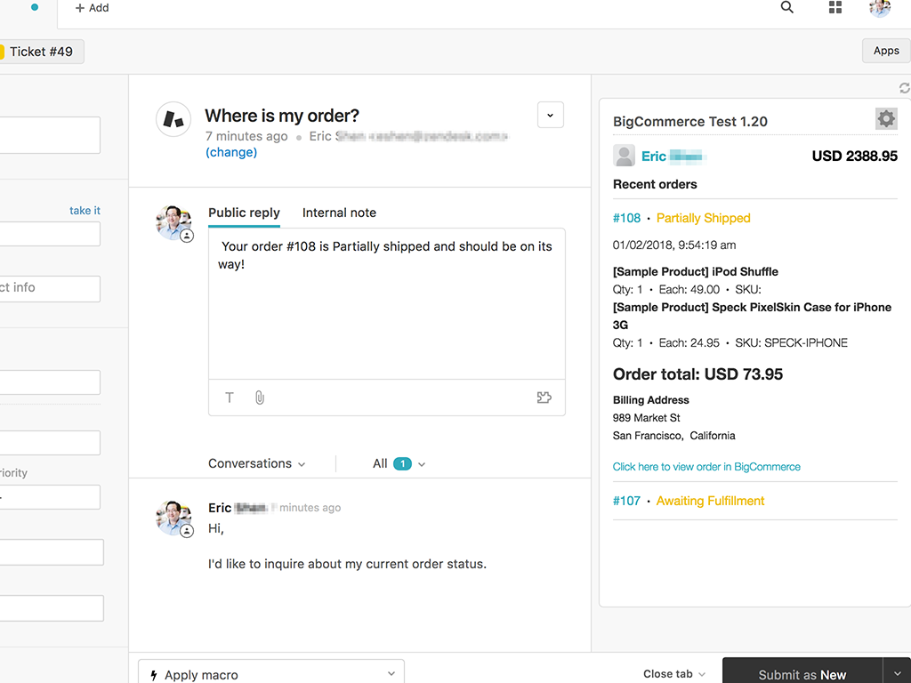 The Zendesk Chat for BigCommerce integration unites your business by displaying critical BigCommerce data alongside Zendesk Chat visitor information. It saves your agents time because they no longer need to switch between BigCommerce and Zendesk to connect a ticket to an order. This integration unites your business by displaying critical BigCommerce data alongside Zendesk Support ticket information. It saves your agents time because they no longer need to switch between BigCommerce and Zendesk to connect a ticket to an order.