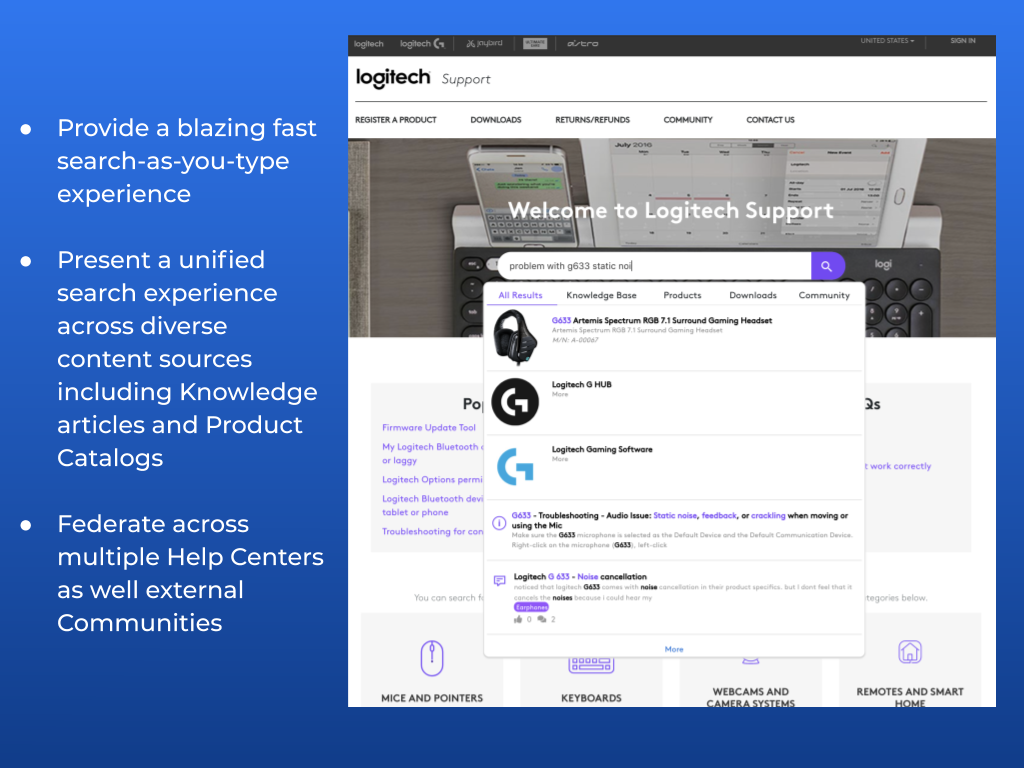 - Enable a unified search experience that federates across multiple content sources, including external communities or even multiple Zendesk Guide implementations.