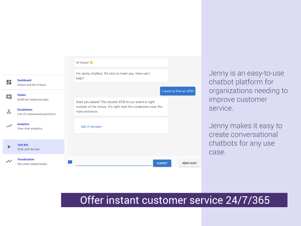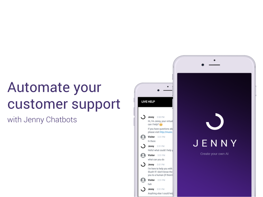 Jenny is an easy-to-use chatbot platform for organizations needing to improve customer experience, increase customer service efficiency and reduce agent churn. Create conversational chatbots for any use case in internal and external communication. Jenny enables companies to increase business agility and ROI by automating customer service interactions.