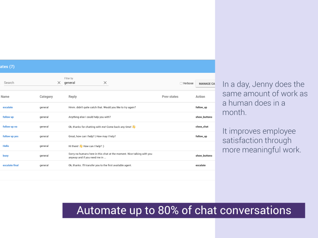 Jenny helps customer service teams automate repetitive customer interactions with a platform for companies that want to quickly and easily train, deploy and maintain integrated chatbots without programming. Teams can resolve over 80% of chats automatically using Jenny. This cuts response times and reduces chat workloads, enabling customer service staff to focus on more complex cases that require emotional intelligence and life experience.