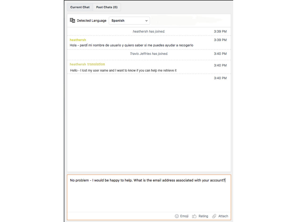 • Step 2: The customer service agent clicks the translate button. Language I/O automatically detects which language the customer is using. Language I/O translates the incoming customer chat into the agent’s language using Machine Translation (MT) technology.