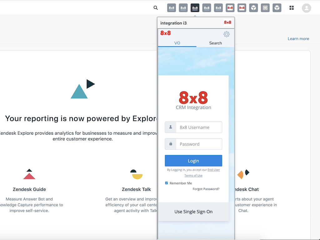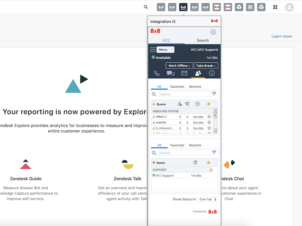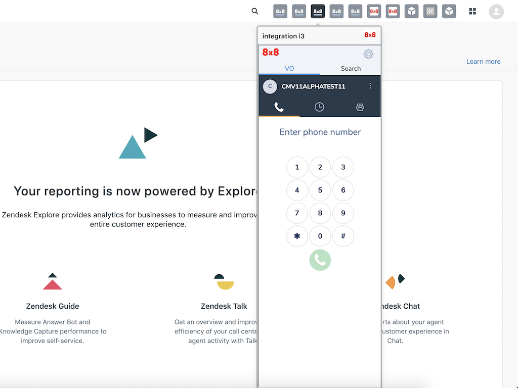 • Once installed, the 8x8 Virtual Call Center app will appear in the upper right corner of the Zendesk interface. Click on it to expand and you are ready to use 8x8 Contact Center from within Zendesk!