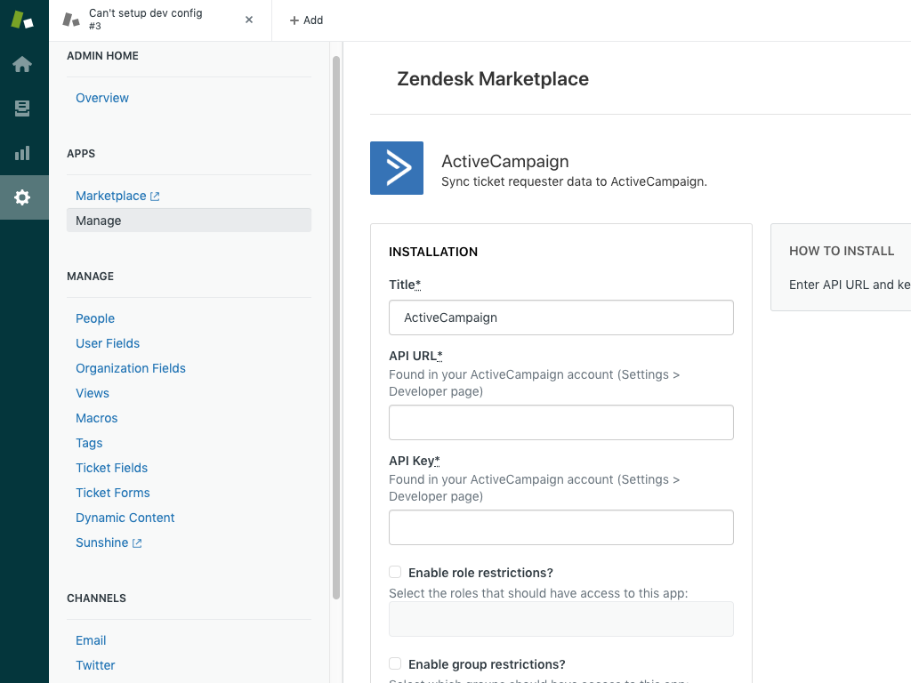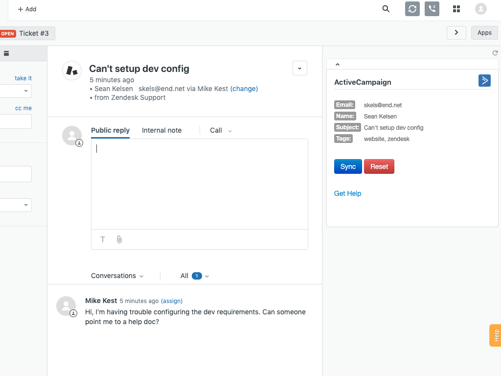Recognized as the leader in Customer Experience Automation, ActiveCampaign helps growing businesses meaningfully connect and engage with their customers. Its SaaS platform enables businesses to create optimized customer experiences by automating many behind the scenes processes and communicating with their customers across channels with personalized, intelligence-driven messages. This will install a widget in the Zendesk sidebar and sync ticket requester details as contact information in ActiveCampaign.
