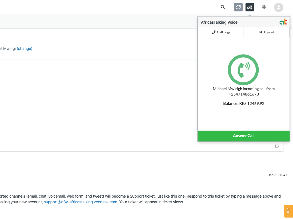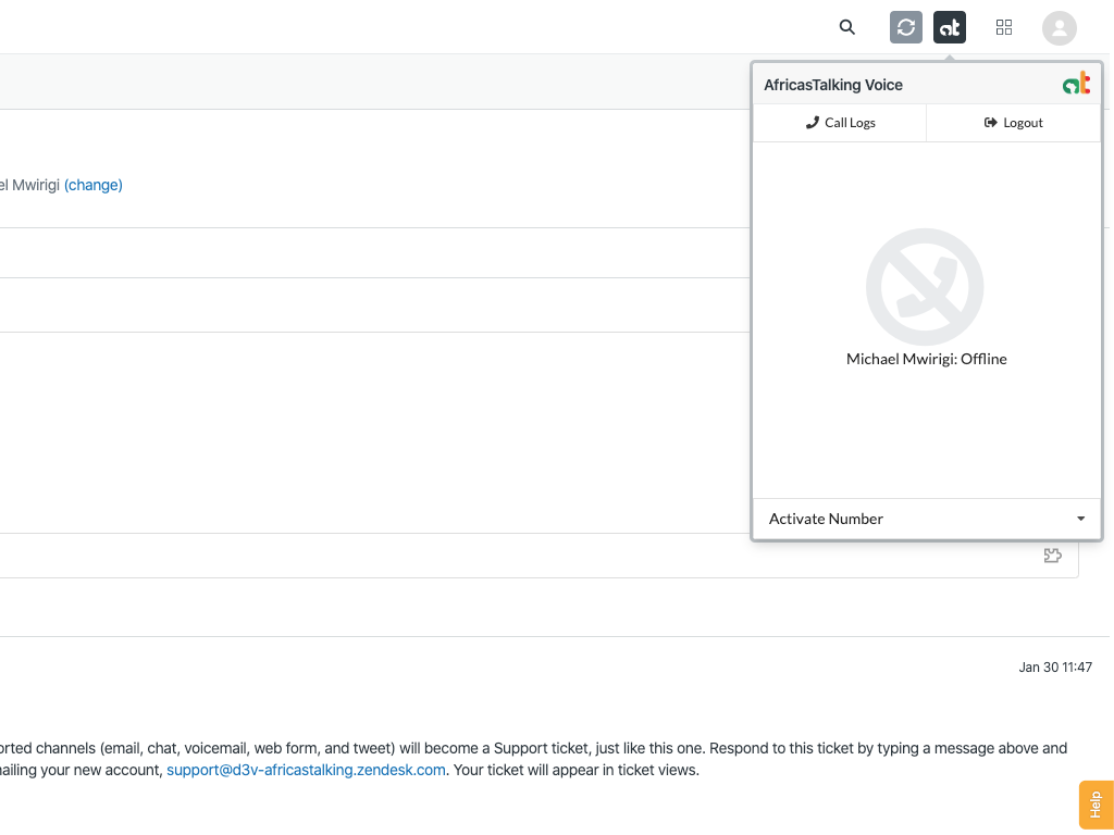 You activate a support phone number (as many as you need) with prefixes +254, +256, +234, many more to come. This will show you as being online and can receive calls. When a call comes in, it will be routed to an available agent. If no agent is online, the caller will get a pre-recorded message requesting them to dial later.