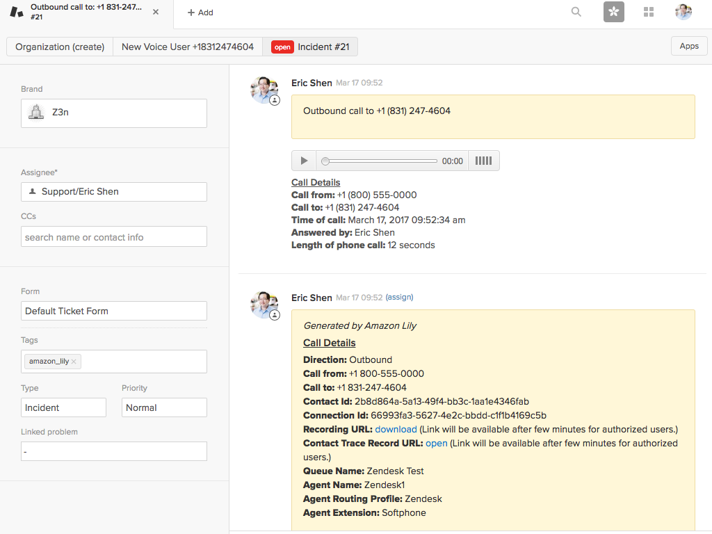 - Link caller to a Zendesk Support end-user profile based on the caller’s phone number