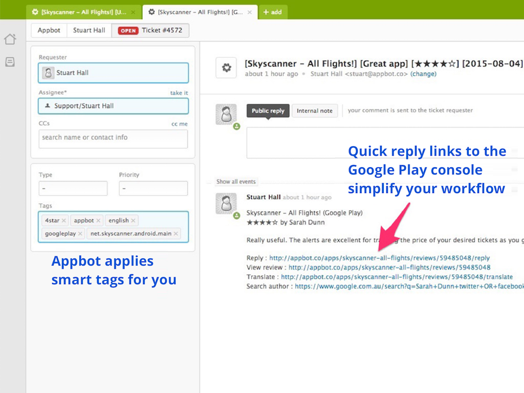 - Identify & respond to the most important reviews first using tags automatically added by Appbot, like star rating or version