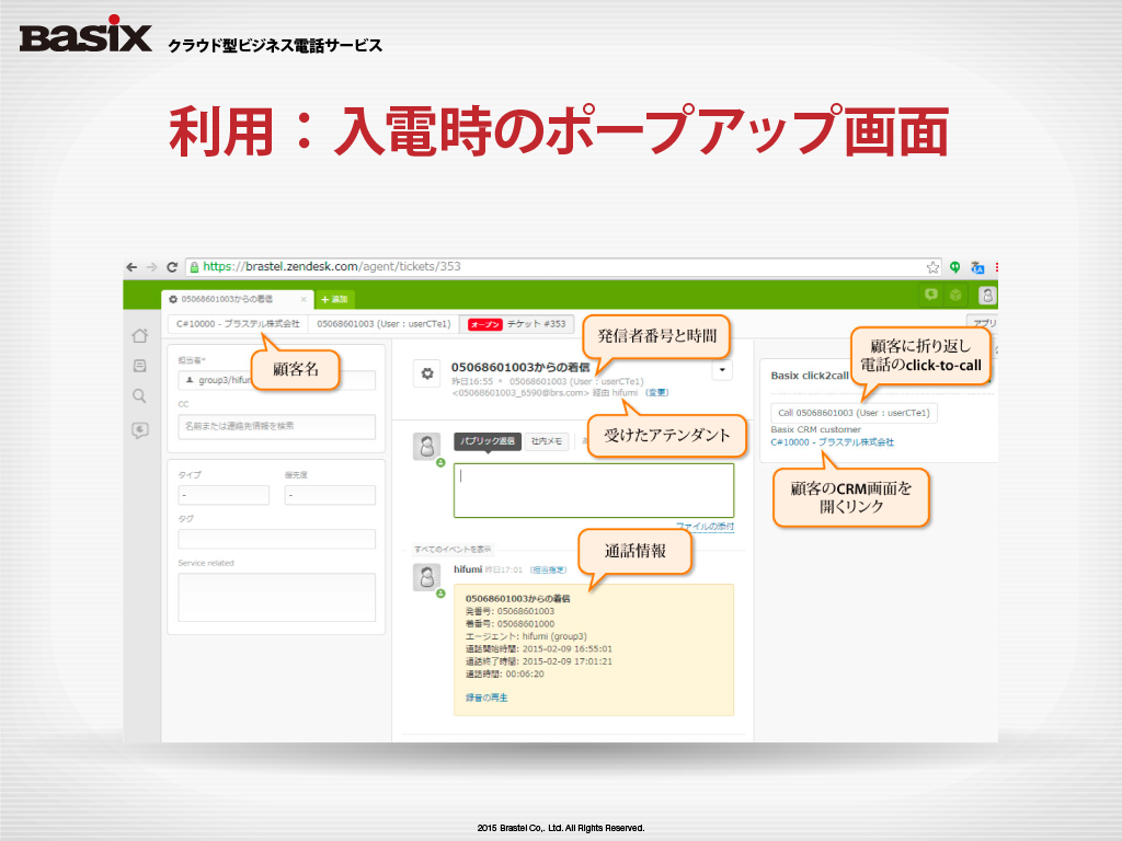 - チケット画面のポップアップ 入電時にZendesk上でチケット画面のポップアップが表示されます