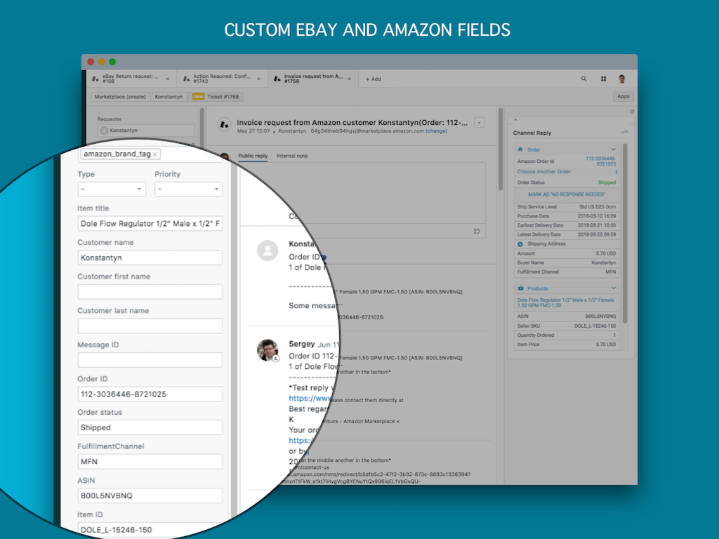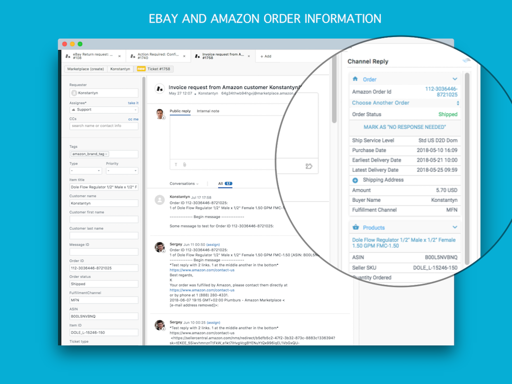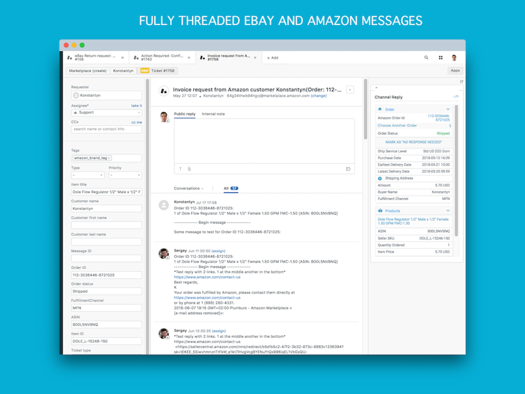 ChannelReply makes it simple to answer marketplace messages directly through Zendesk. You’ll have access to threaded conversations with all your eBay and Amazon customers. We’ll also give you the info you need to stay organized and provide effective support, including: * eBay Buyer Name * Amazon Customer Name * eBay Item Title * Amazon Item Title * eBay Item Number * Amazon ASIN * eBay Listing Hyperlink * Amazon Listing Hyperlink * eBay Order ID * Amazon Order ID