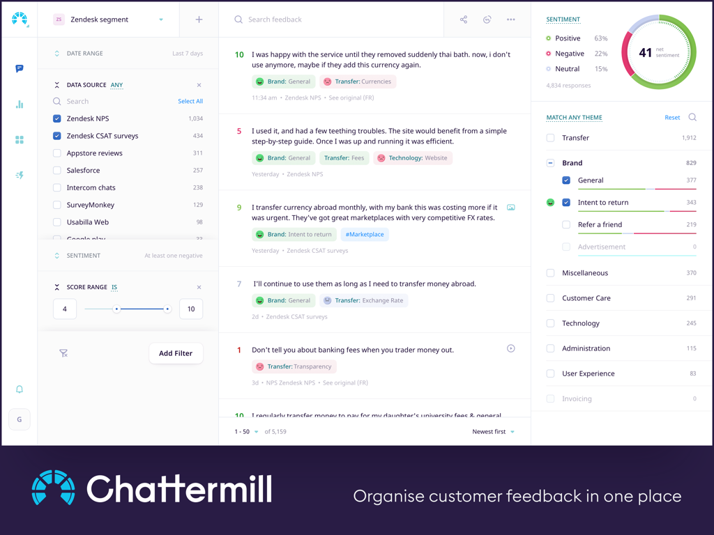 Struggling to make sense of your customer feedback and take action? With Chattermill your whole team gets instant access to insights hidden in customer feedback. Chattermill uses cutting-edge AI to give your team real-time insight into what your customers are saying, giving you the power to create superior products and deliver exceptional service.