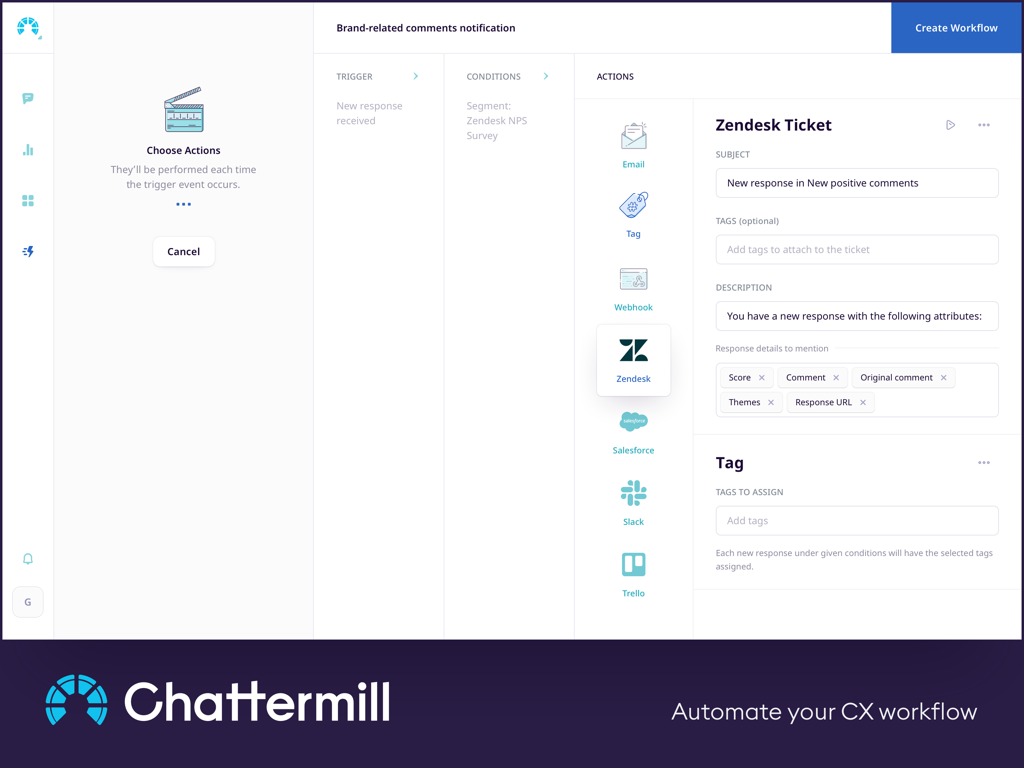 - CX Automation (eg. create Zendesk tickets for NPS detractors, send a Slack message when a ticket mentions a topic)