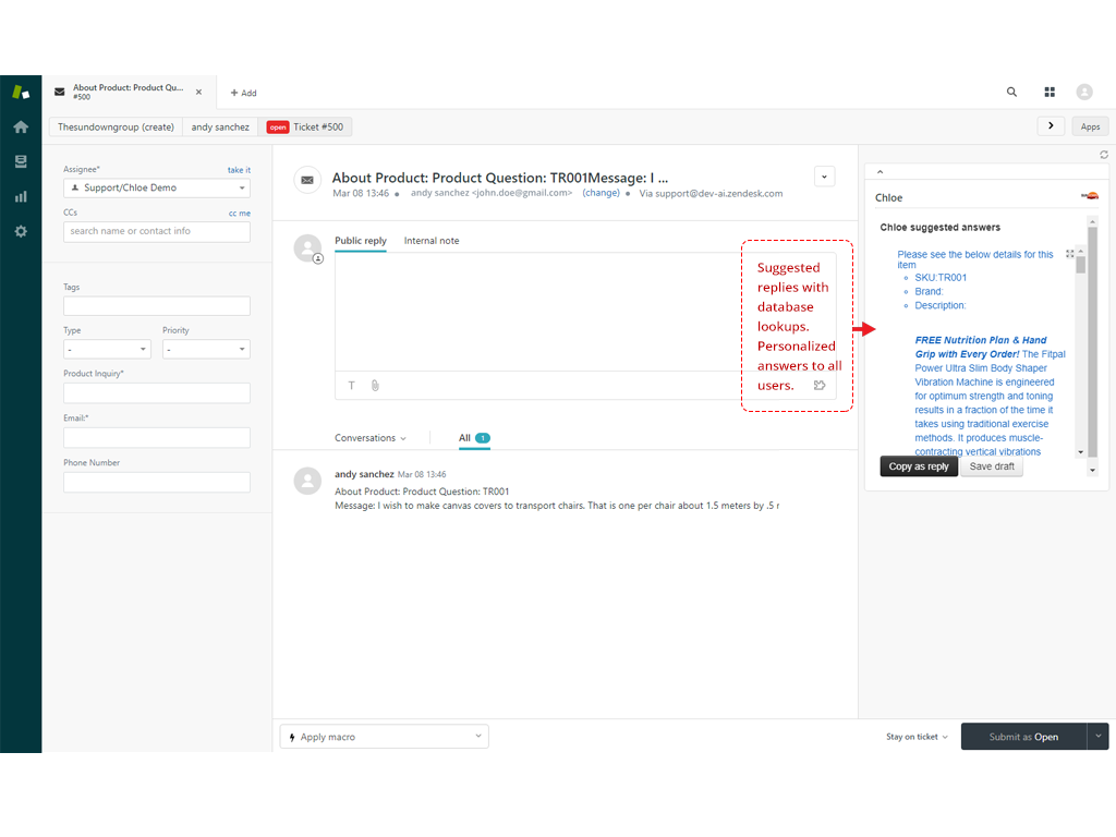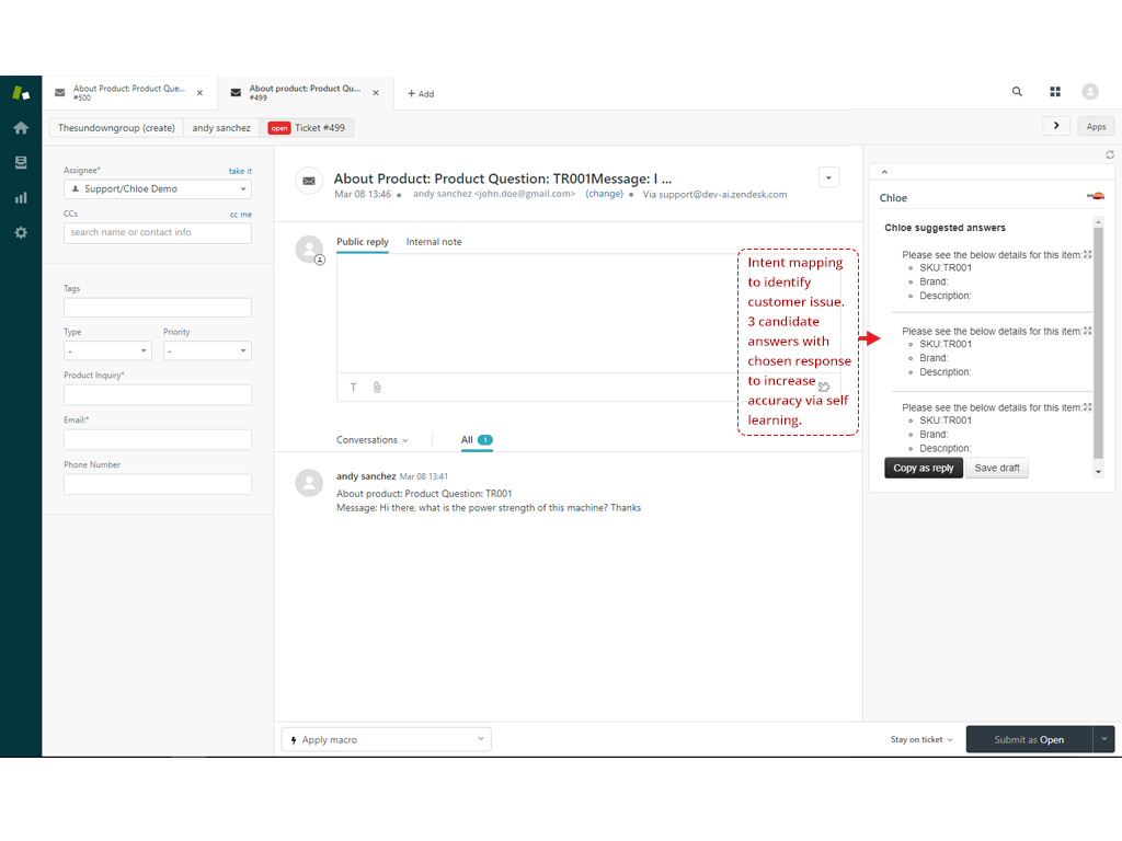 Chloe is an AI automation self service solution with the ability to simulate agents and provide customers with answers through Zendesk. She could also be used to augment existing agents by looking up information in databases and providing them with suggested replies. Among her benefits, Chloe understands content and intent from users, provides contextual and personalized responses, and triggers actions on the customer’s behalf.<br/><br/>In addition, Chloe has additional algorithms that are trained on specific use cases to analyze and act on conversations. These analytic algorithms can measure and predict: overall quality, sentiment, brand messaging, fraud detection, level of liability, interesting conversations, and % script adherence.<br/><br/>Here are some of the benefits of using Chloe with Zendesk:<br/><br/>* Timely resolution of customer requests by providing customized answers in real time <br/>