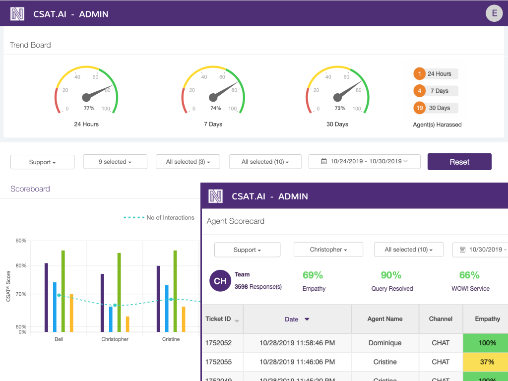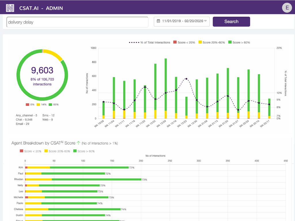CSAT.AI improves customer experience proactively. Automate the QA process while providing complete oversight including: agent scorecard, performance trend, and tag search.
