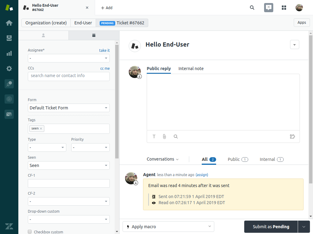 As soon as an email is opened, Email Tracking updates a custom field connected to the ticket and adds a note with corresponding information.