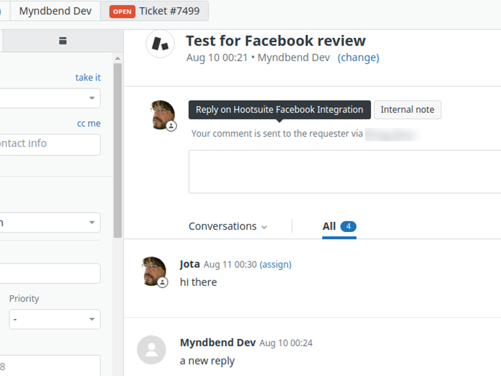 Zendesk agents can comment on tickets and their responses are automatically added to the Facebook post