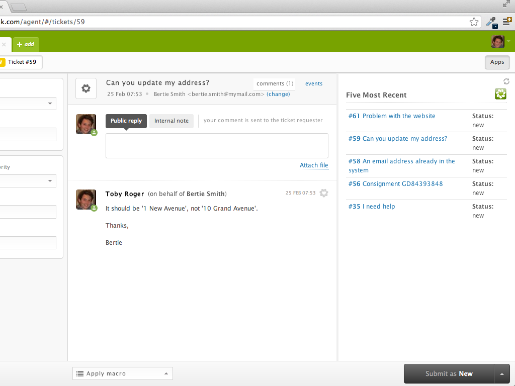 The Zendesk Support Five Most Recent app gives you more context around past support requests made by a customer. The app displays the five most recent tickets the customer has submitted, so you have a complete view of the recent questions or issues the customer has had.