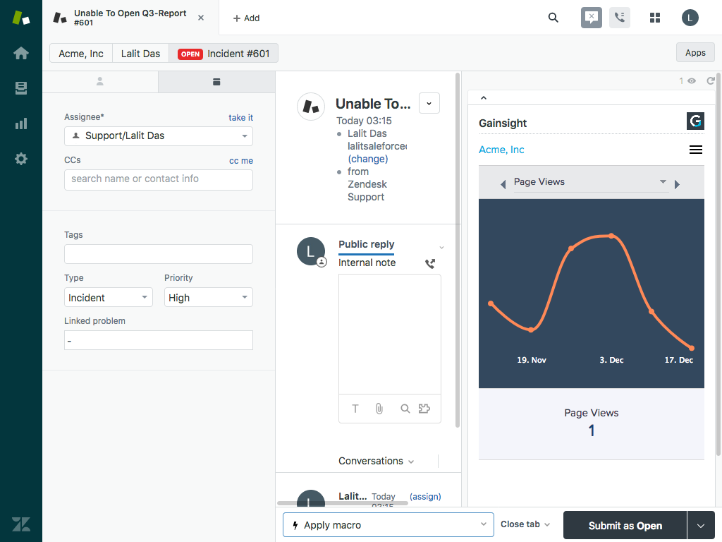 View key information like usage, customer health score, recent survey responses and other linked data from Gainsight and SFDC so your Support team can get a 360 view of your customer next to a live ticket in Zendesk.