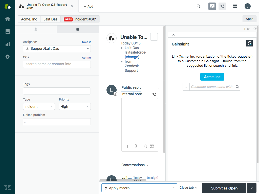 You should already have Gainsight installed and running in an SFDC org before you can use this app in Zendesk. This app also requires an additional license from Gainsight. Please contact your Gainsight sales representative or email sales@gainsight.com.