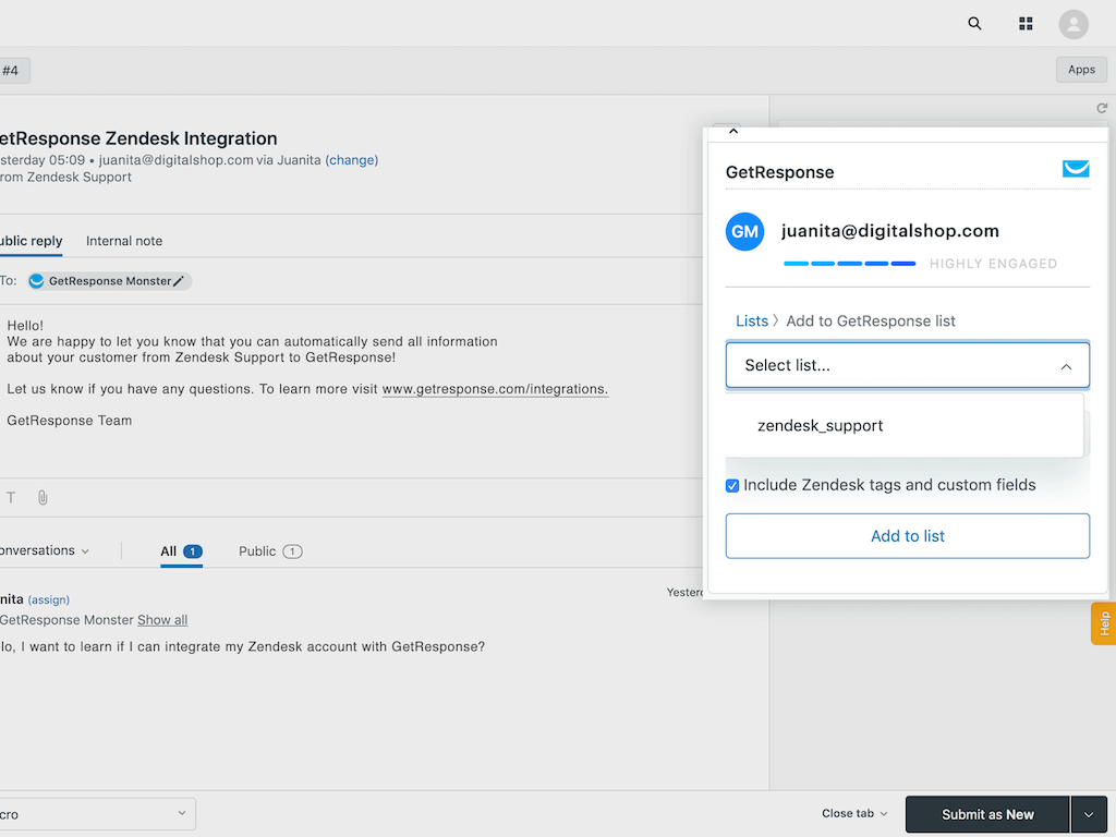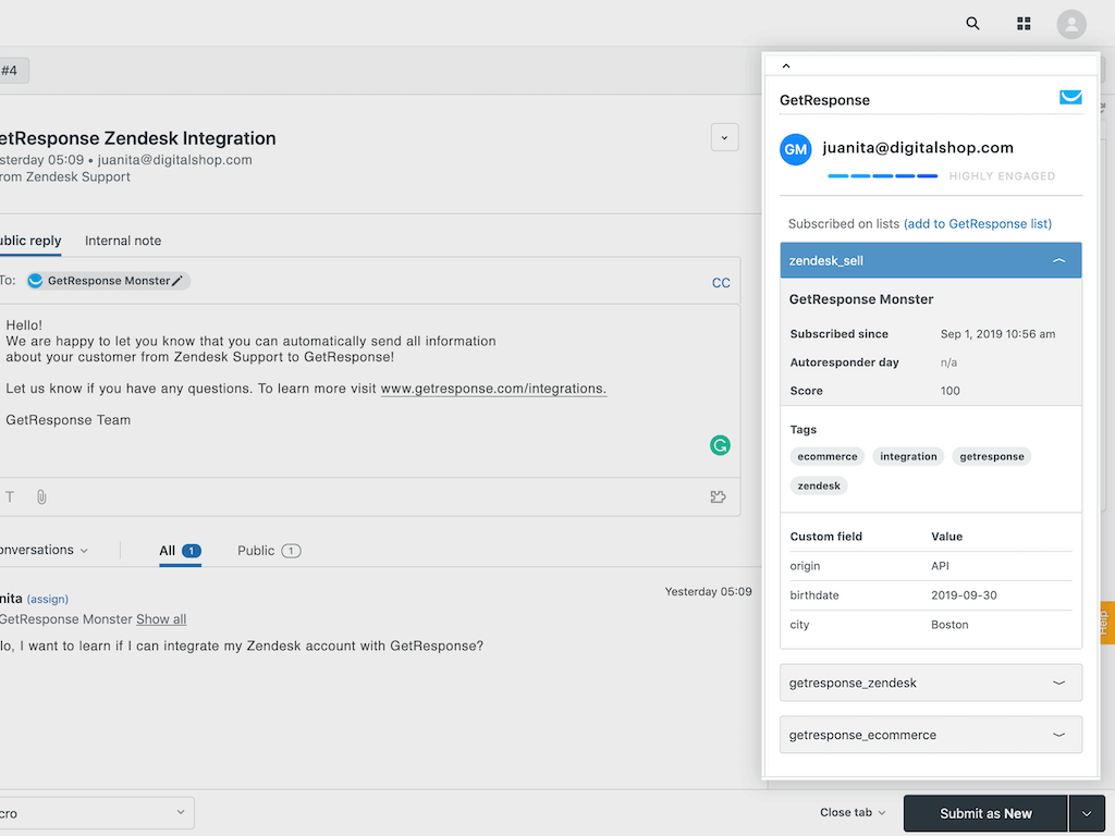 The GetResponse widget will install in the Zendesk Support sidebar.