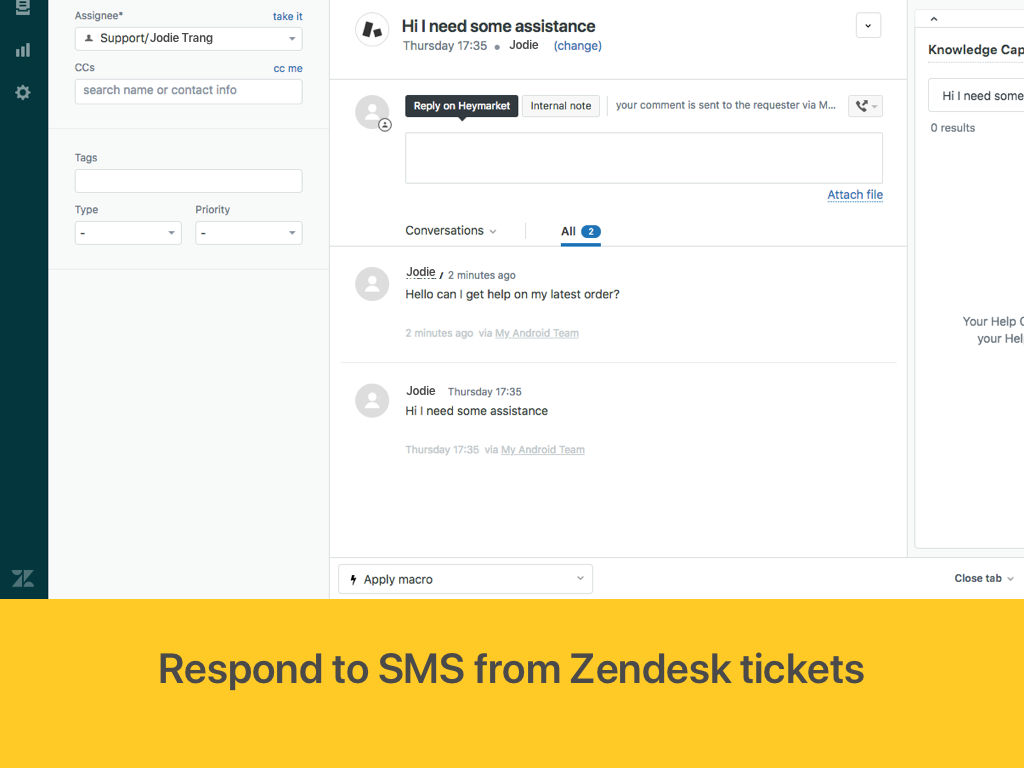 Heymarket’s Zendesk integration will automatically create and push business text messages to your Zendesk ticket queue. You will be able to view the SMS both in Zendesk and in Heymarket.