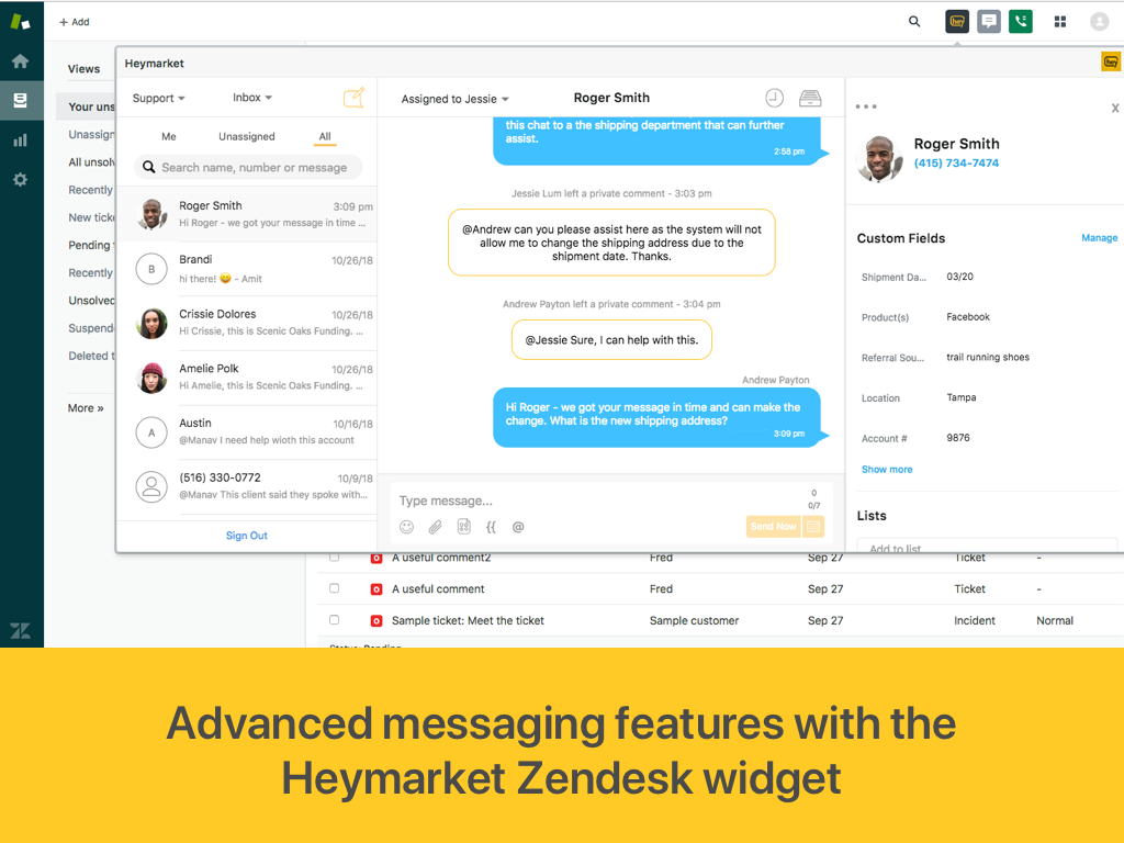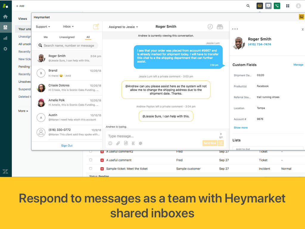 The Heymarket channel integration automatically creates a Zendesk ticket for all incoming text messages and lets agents respond directly from Zendesk. Contacts will also be automatically created in Zendesk for incoming text messages from your contacts in Heymarket.