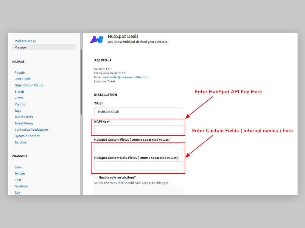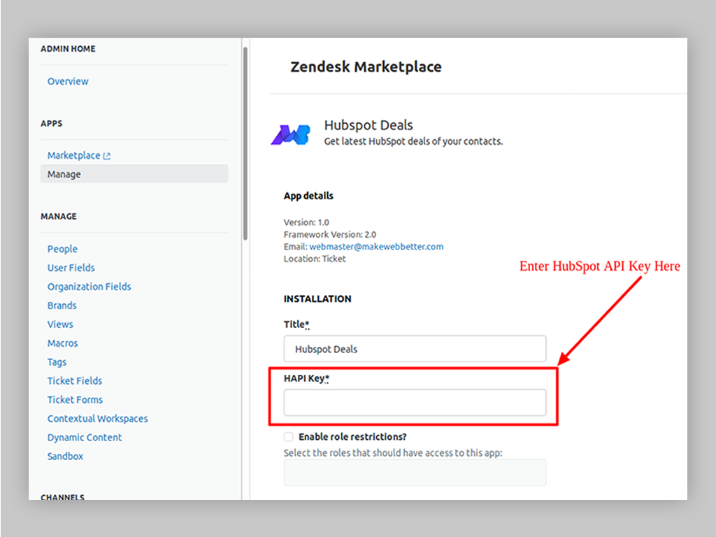 >Hapi Key: You can find this key in your HubSpot portal ( Click the 'Gear' icon > Integrations > API Key ).