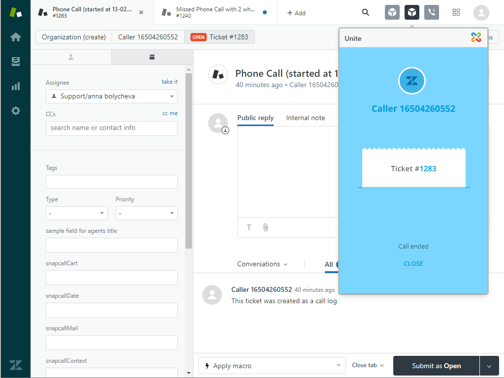 - Integrated calling: Easily place calls using Intermedia Unite directly within Zendesk.