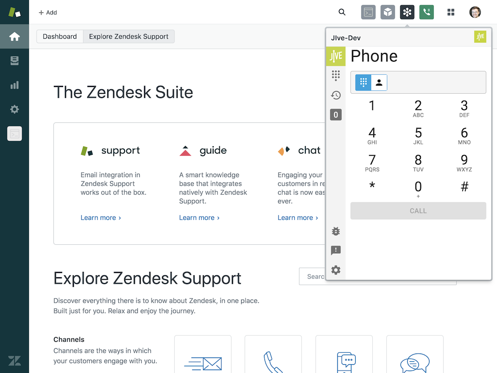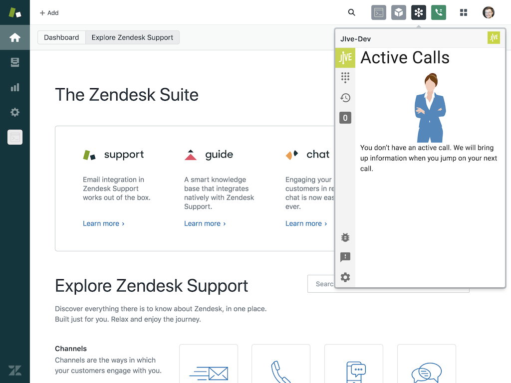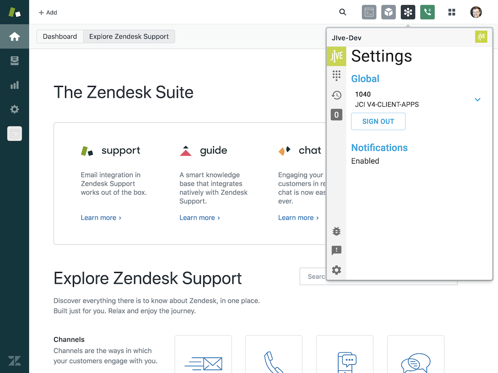 - Navigate back to your Zendesk homepage. The Jive app icon is displayed at the top right corner.