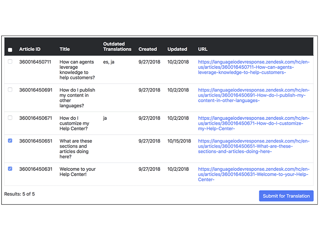 The Language I/O® Help plugin for Zendesk automates the professional human (or machine) translation of your knowledge base, incorporating translation memory, glossaries and automatic link rewriting. Specifically, Language I/O Help for Zendesk: