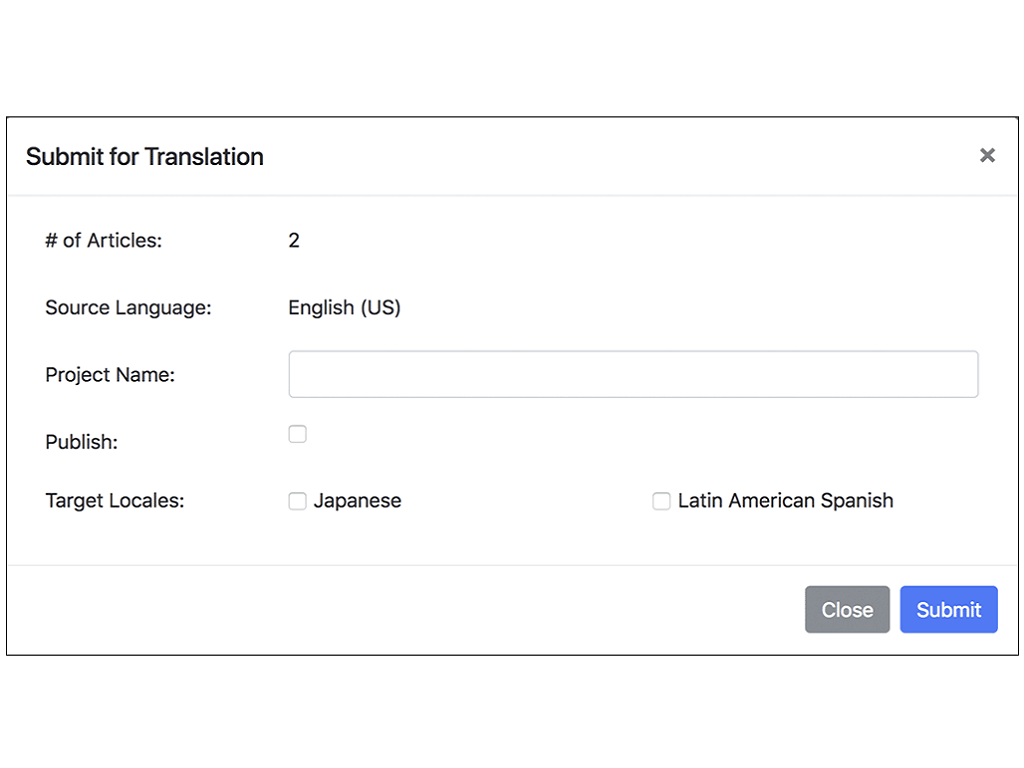 - After selecting what to include in the project, simply submit the article for translation, name your project, select target locales and specify whether the content should be automatically published