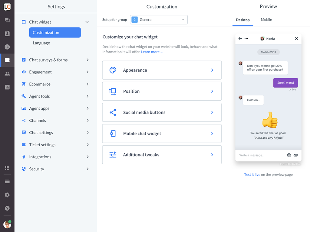 With LiveChat you can customize your chat window theme, efficiently manage chat traffic through smart routing, send automatic and personal greetings, and more.