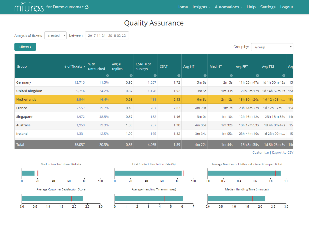 Miuros Insights makes it easy to check how an agent, a team, or specific ticket type is performing with respect to the average, across the KPIs that matter to you. Discover trends, visualize their evolution over time, drill down and slice your data to make better decisions.