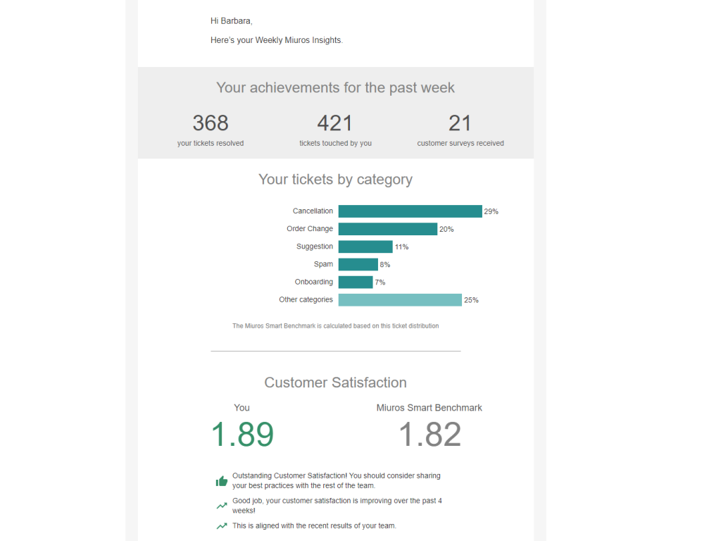 Miuros saves time to the management team by computing and emailing its performance analysis together with a written conclusion on how to interpret the data of the report.