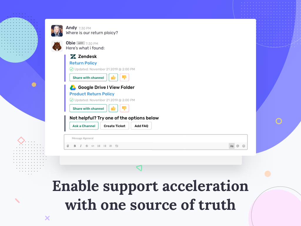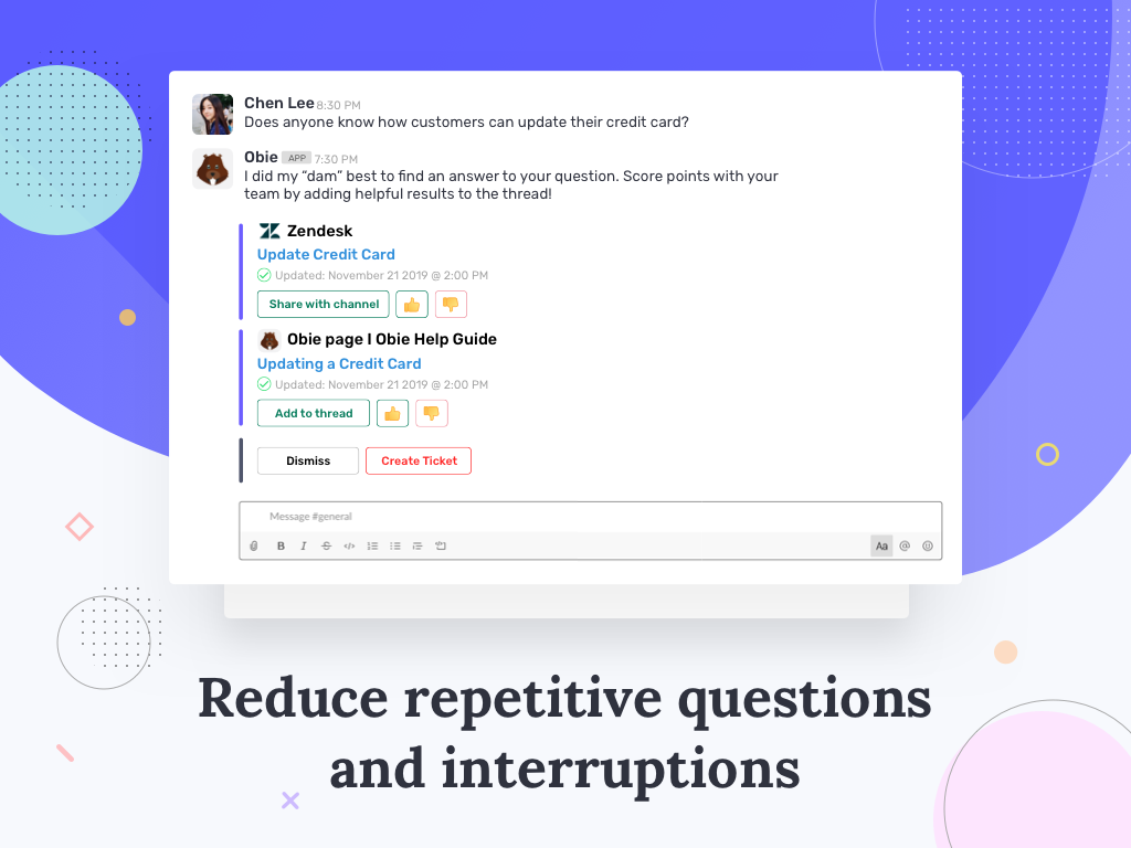 Join 5,000+ teams who have used Obie to create a single source of truth for their knowledge base, wikis, and documentation. Reduce repetitive questions, increase first call resolution and accelerate support.