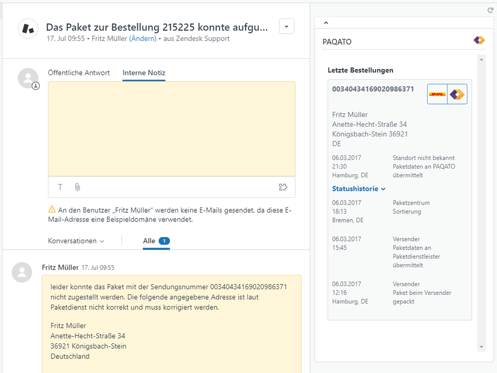 The PAQATO Zendesk app offers perfect assistance for incoming service requests: When viewing a ticket, the app will display the current shipping status for a customer's order. All relevant customer information and events, as well as previous orders and the corresponding shipment tracking are also displayed in one overview. The app enables you to process service requests without extensive research and with just a few clicks.