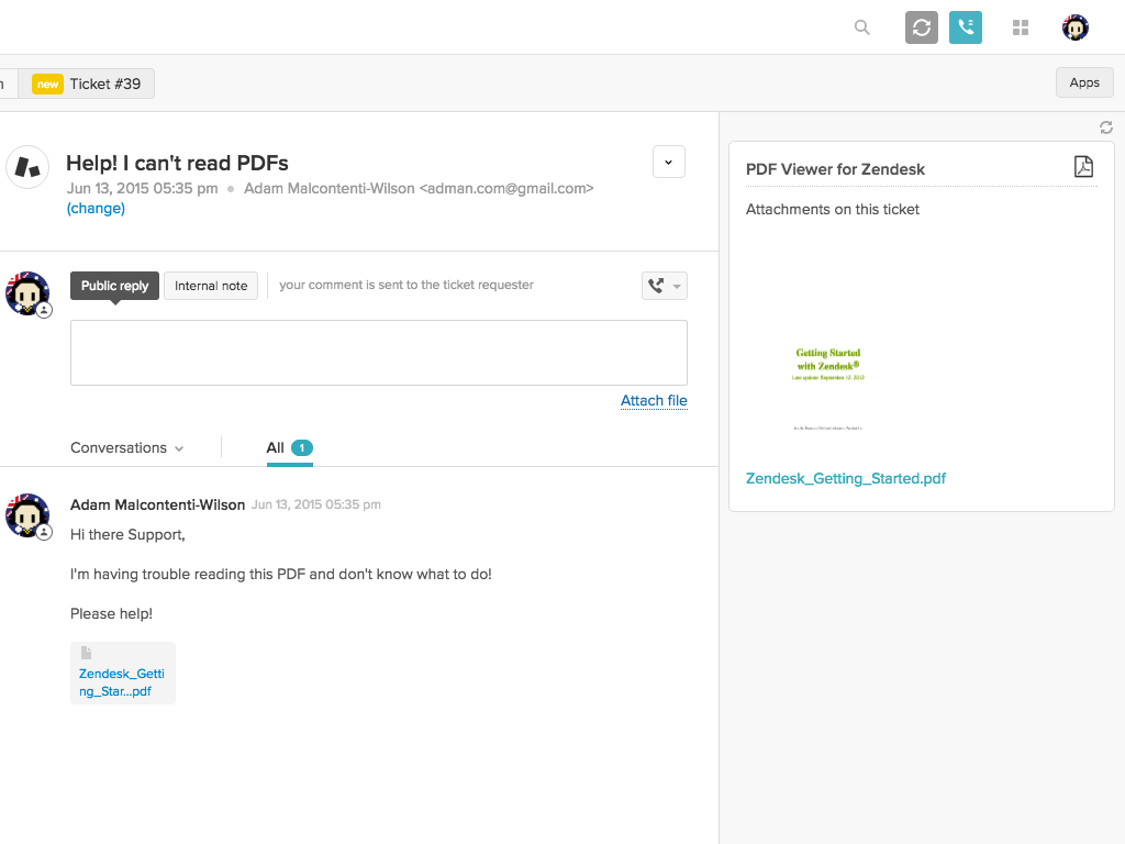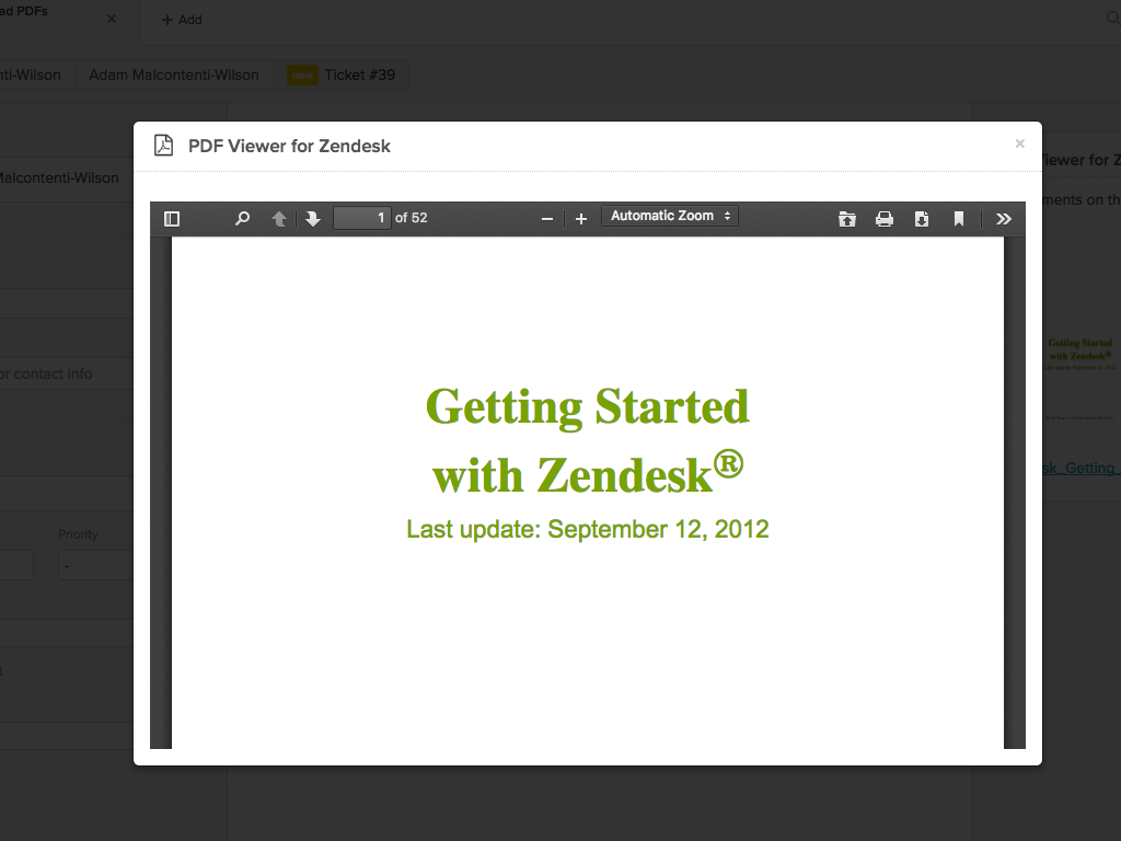 The PDF viewer app makes it easy to view PDF attachments alongside your Zendesk Support tickets.