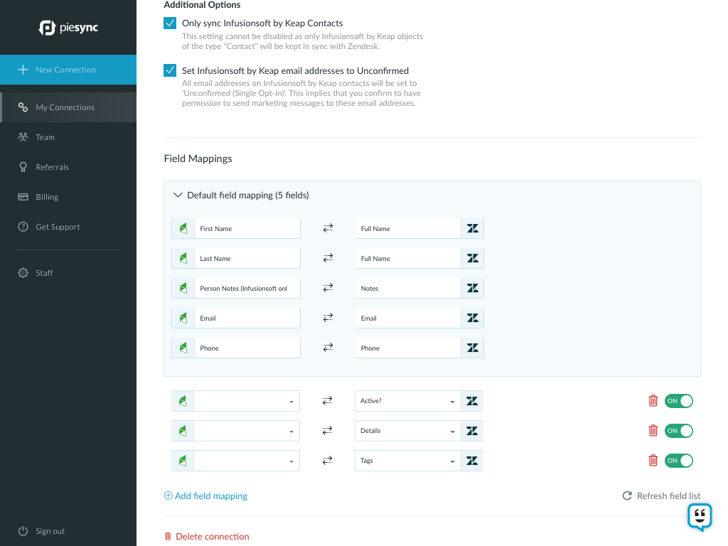 Apps supported by PieSync include CRM's like Salesforce, Hubspot, Mailchimp, Pipedrive, Teamleader, Dynamics 365, Zoho CRM, Zendesk Sell, Copper, Nimble, Capsule CRM, Podio, Insightly,...