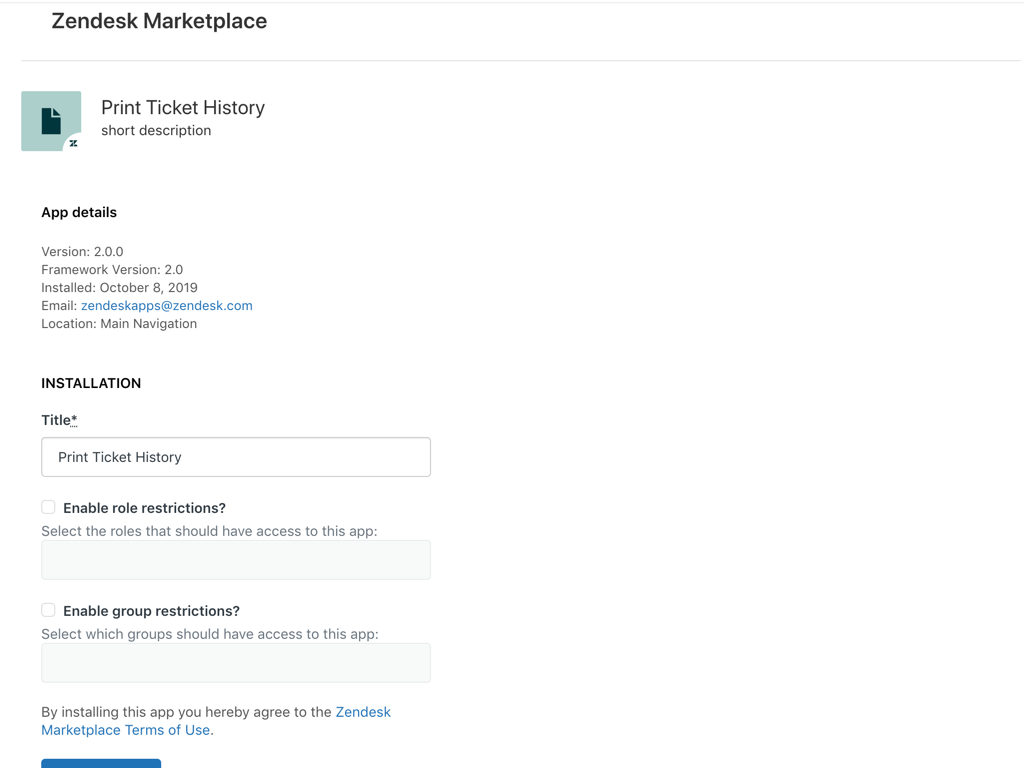 Install the Print Ticket History app and specify any group or role restrictions. If you have the Basic plan, choose if you'd like to block Internal Notes when printing.