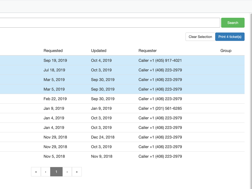The Print Ticket History app allows a user to search and select a group of tickets and print them out in PDF format.