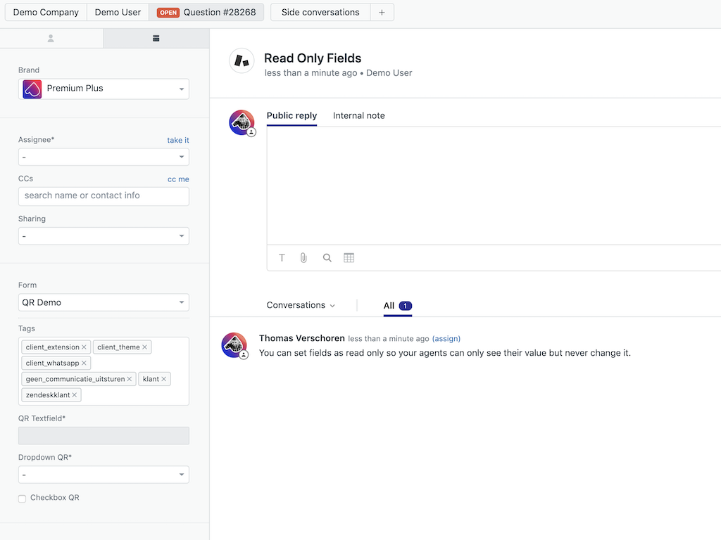 This app allows you to make certain fields readonly for your agents, similar to how they are readonly for your endusers. Fields can still be changed via triggers and automations.