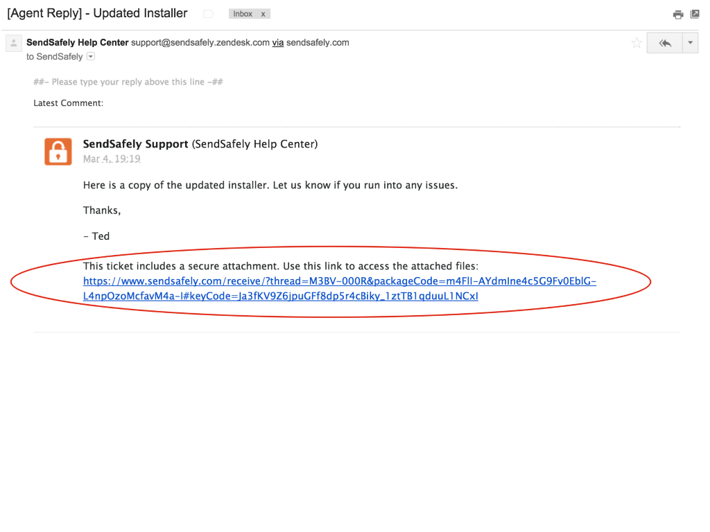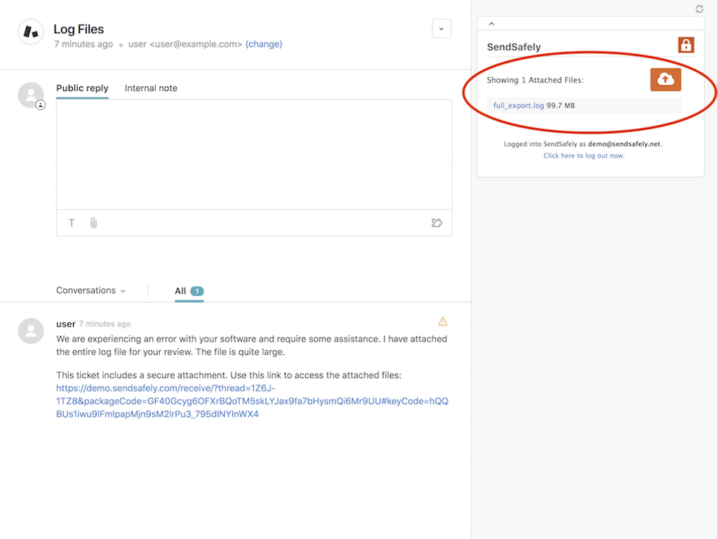 Files attached using the SendSafely Zendesk app are uploaded directly to SendSafely, bypassing any file size restrictions associated with your Zendesk plan. A secure link is automatically inserted into the ticket for users to access the files.