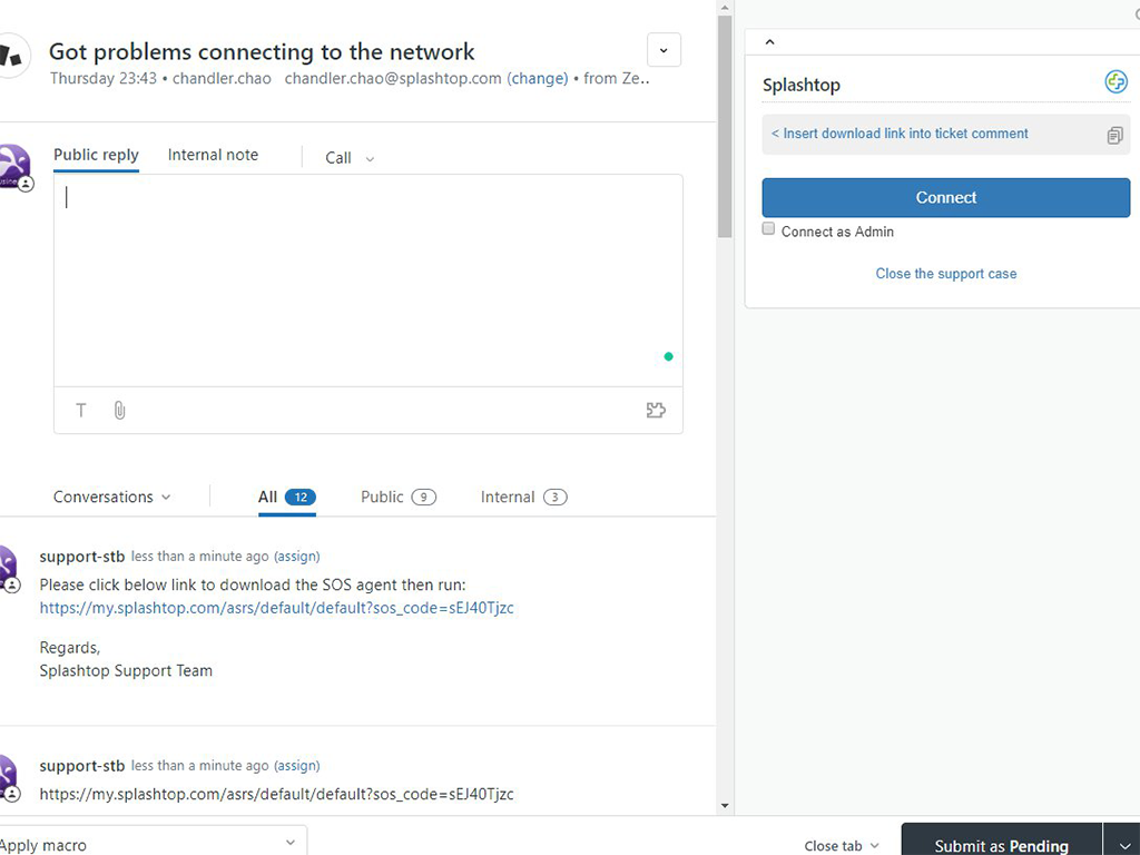 Splashtop has now integrated with Zendesk to enable your technicians to remotely support your users using the Splashtop On-Demand Support (SOS) service.