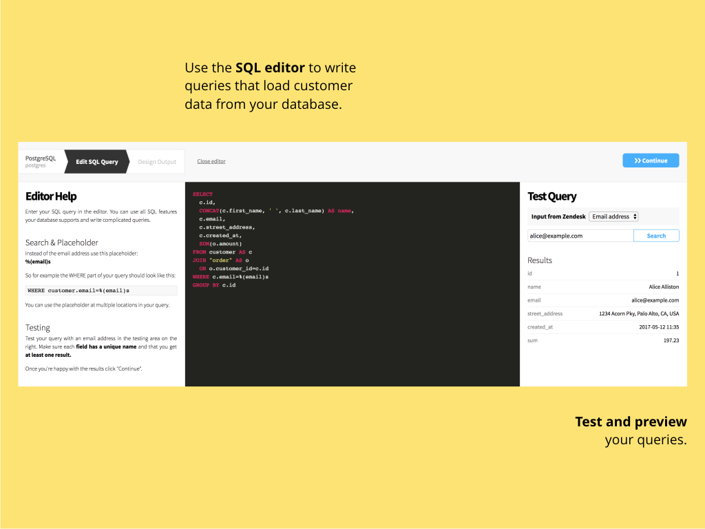 By default SQL Connector searches by email address or phone number. If you store an ID in a custom field in Zendesk, you can also use the custom field to look up customer data.