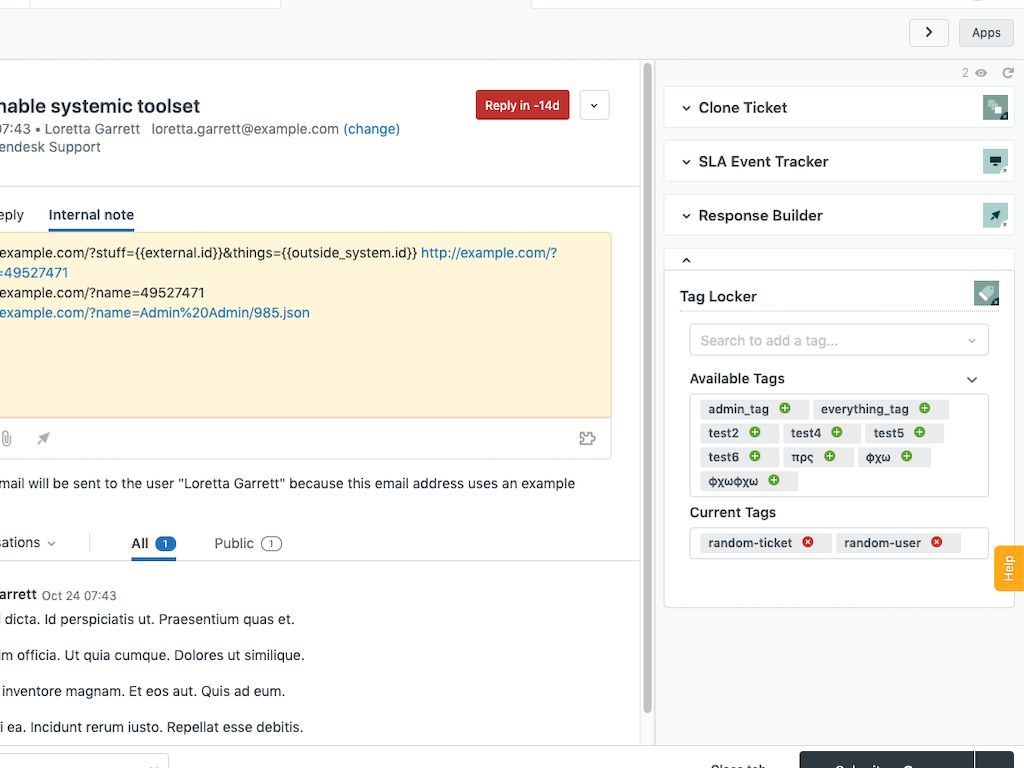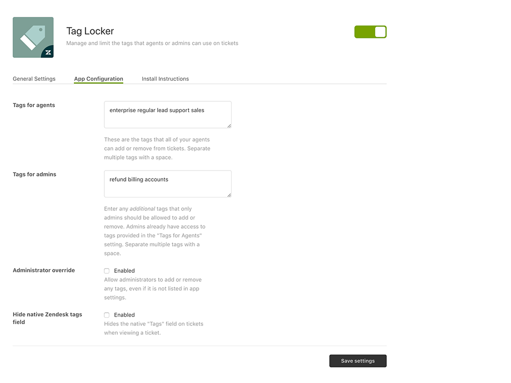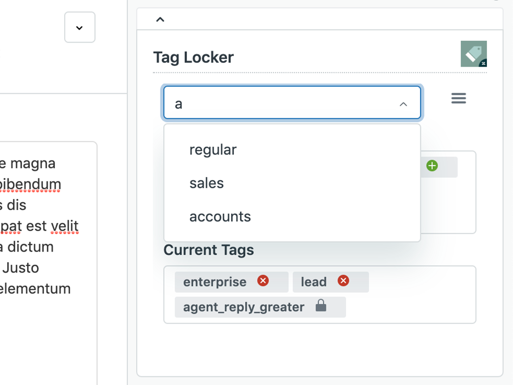 Tag Locker is an app that allows an administrator to manage and limit which tags can be used by agents or administrators on tickets. With this app, administrators and agents can do the following: