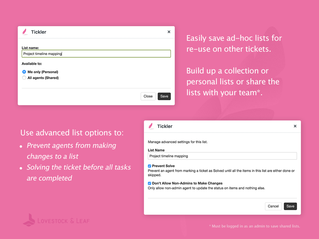 Saved lists being as ad-hoc lists that then saved, so they can be easily reused on similar tickets. Saved lists can also be appended to an ad-hoc list, if there's already one on a ticket. Agents can save lists to their profile, which they can manage from the app. Admins can also save shared lists, which are available to all agents with access to Tickler. Saved lists also come with features not available with regular ad-hoc lists. For example, saved lists can be marked as 'uneditable', so agents can only update the status of tasks. You can also prevent a ticket from being solved until the list is complete.