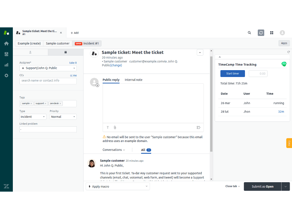 • Enables you to run the timer directly in Zendesk. It records time for each ticket and agent and synchronizes it with TimeCamp.