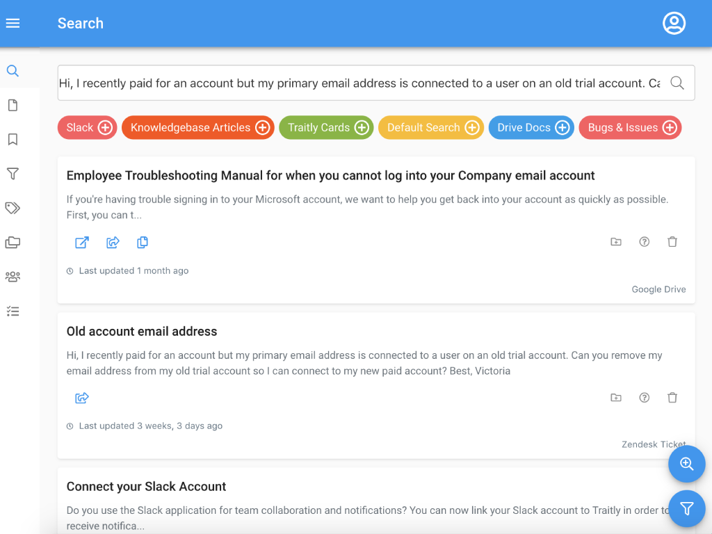 Traitly helps make your agents up to 3x more productive by eliminating the need to switch between tabs or ask a colleague. The Traitly app enables your customer-facing teams to search across all your knowledge platforms directly from the Zendesk ticket view.
