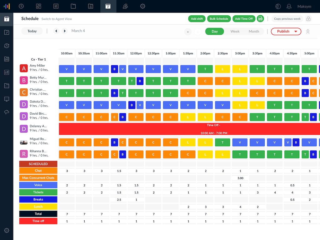 - Scheduling: fast and easy! Create detailed intraday schedules and view staffing across all channels. Even better - agents can view their schedule without ever leaving Zendesk.
