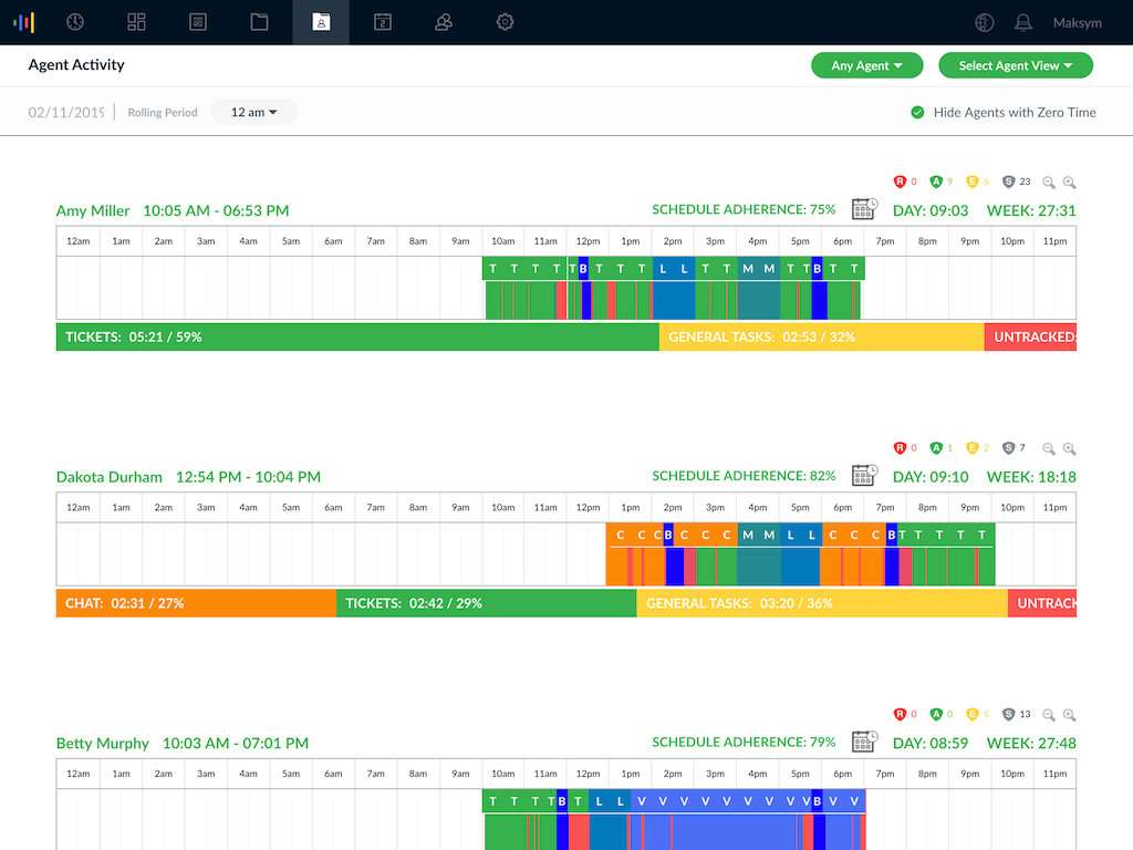 - Schedule adherence: understand how well your agents are adhering to their schedules by overlaying their actual activity vs. expected schedule or via a percentage score.